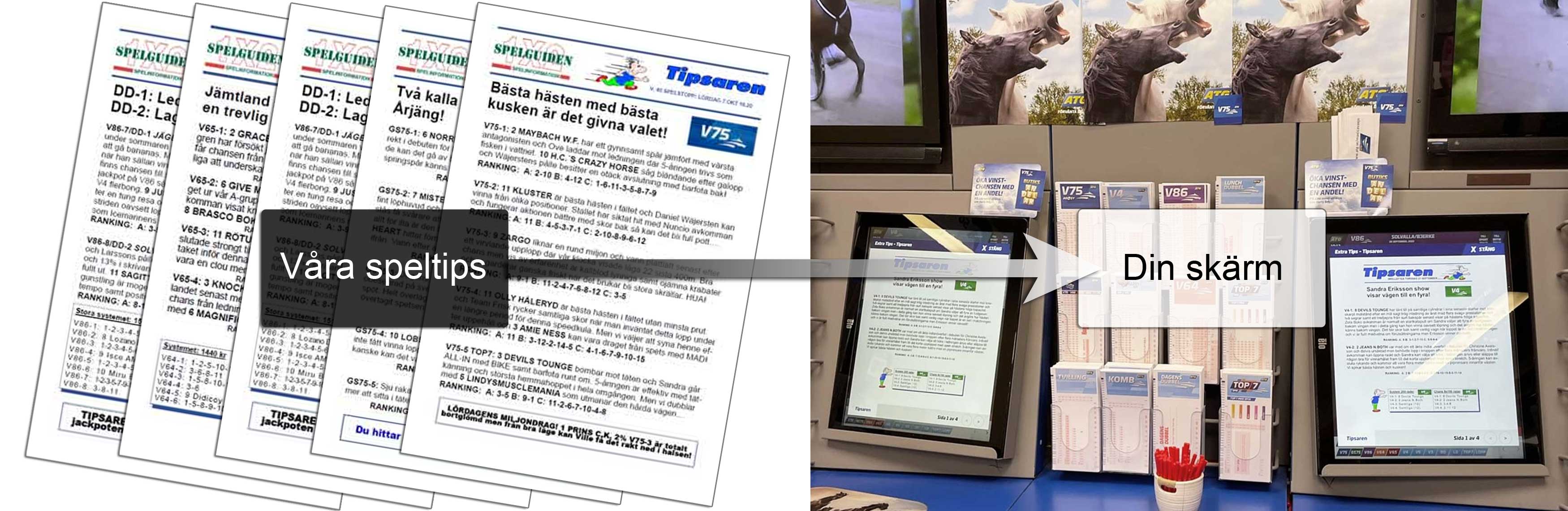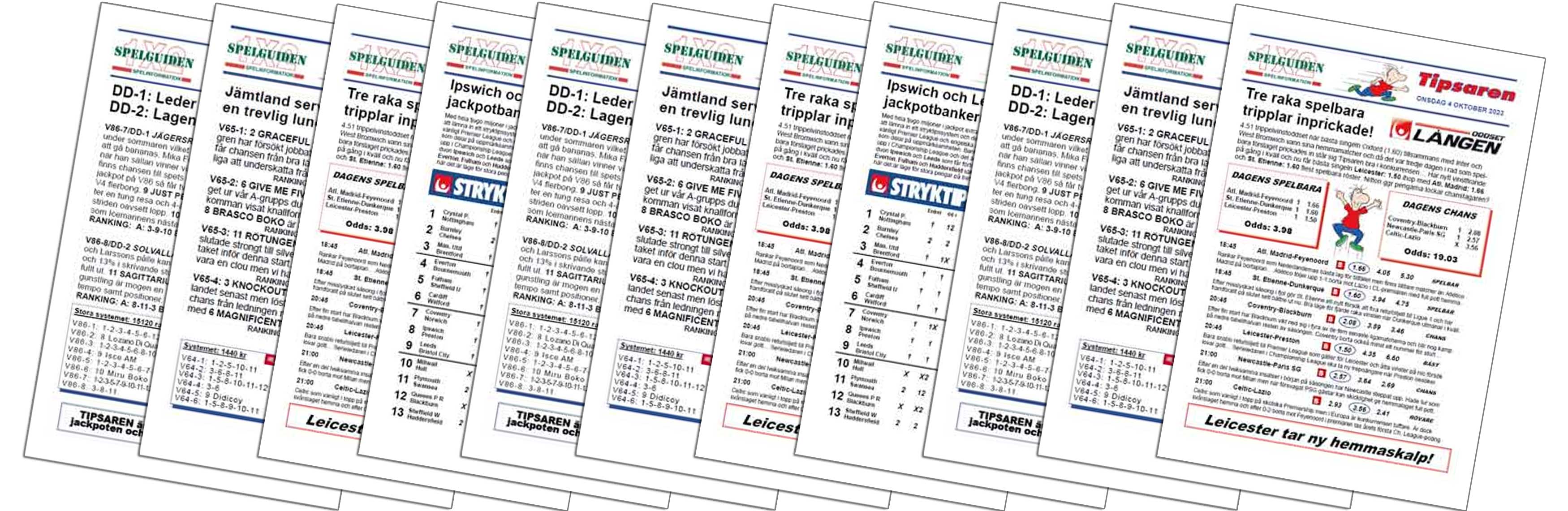Du får alla våra speltips för både Svenska Spel och ATG! Använd till att skapa andelsspel eller skriv ut och sätt upp på väggen i butiken åt dina kunder.